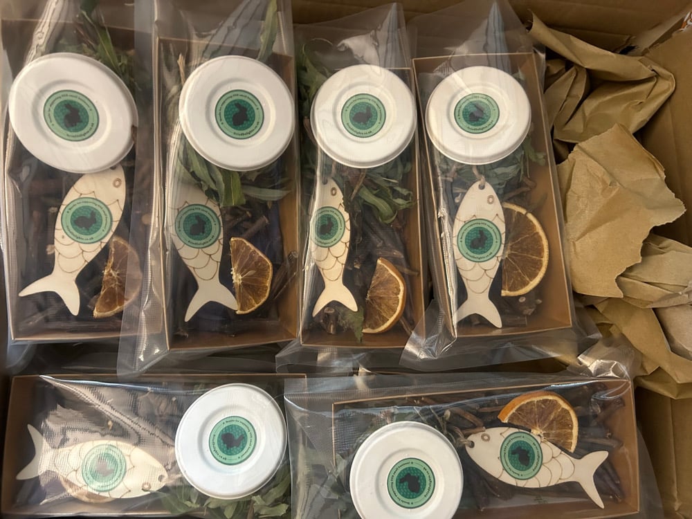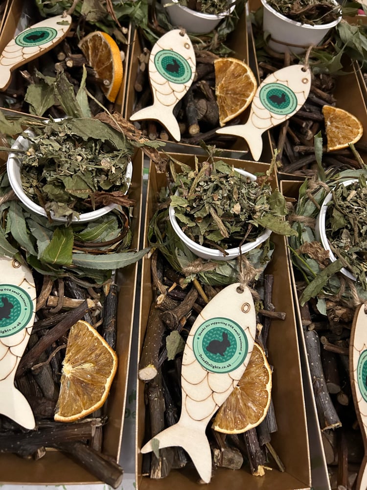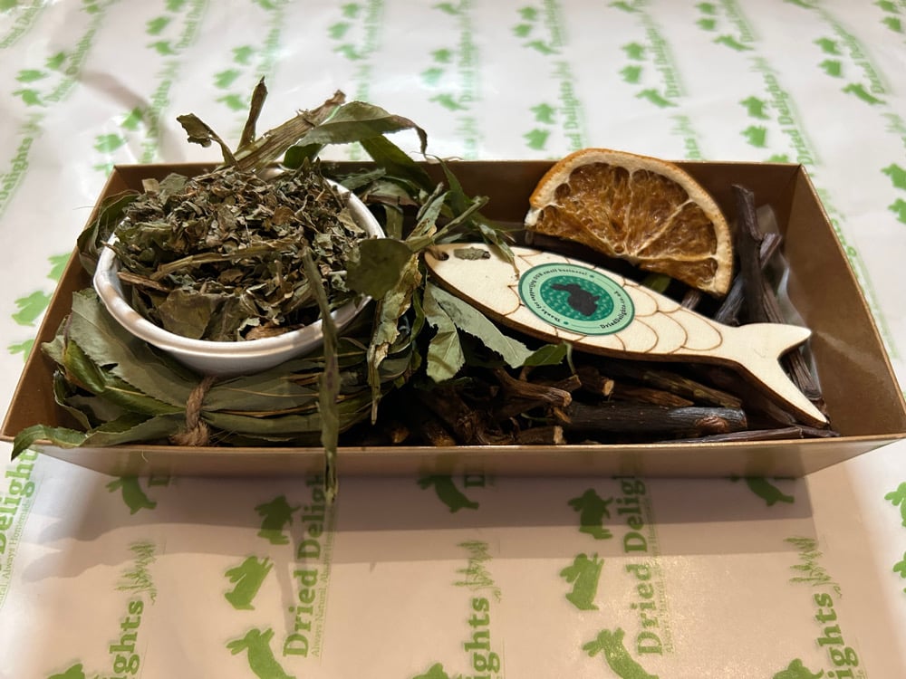 card tray, tissue paper, apple and pear branch pieces, dandelion root, wooden fish with twine, mini willow wreath, orange slice, paper cup with lid with dandelion and fenugreek in it.