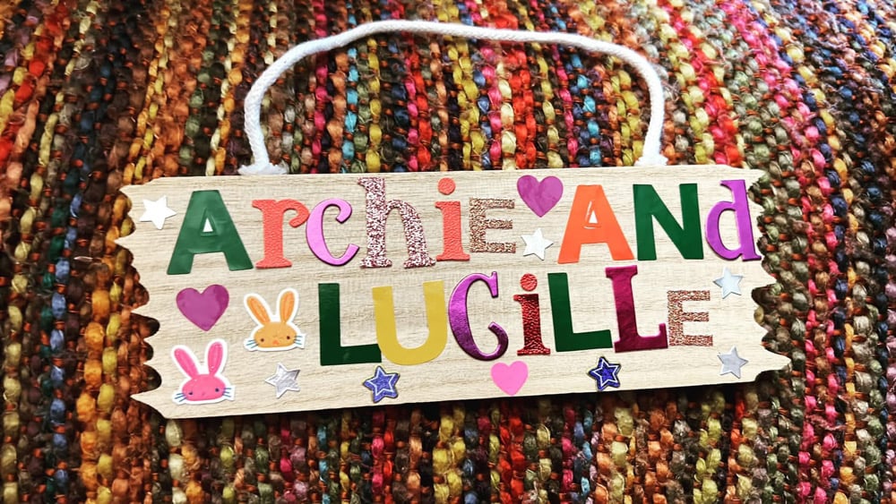 Wooden hanging sign with personalised alphabetical stickers handmade by lorna. These are name or slogan signs.