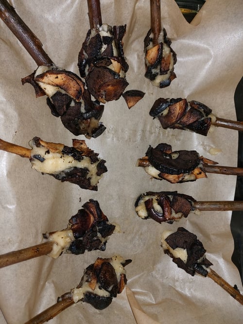 Thick willow branch pieces covered with banana coated willow pieces with baked apple pieces baked into place at one end.
